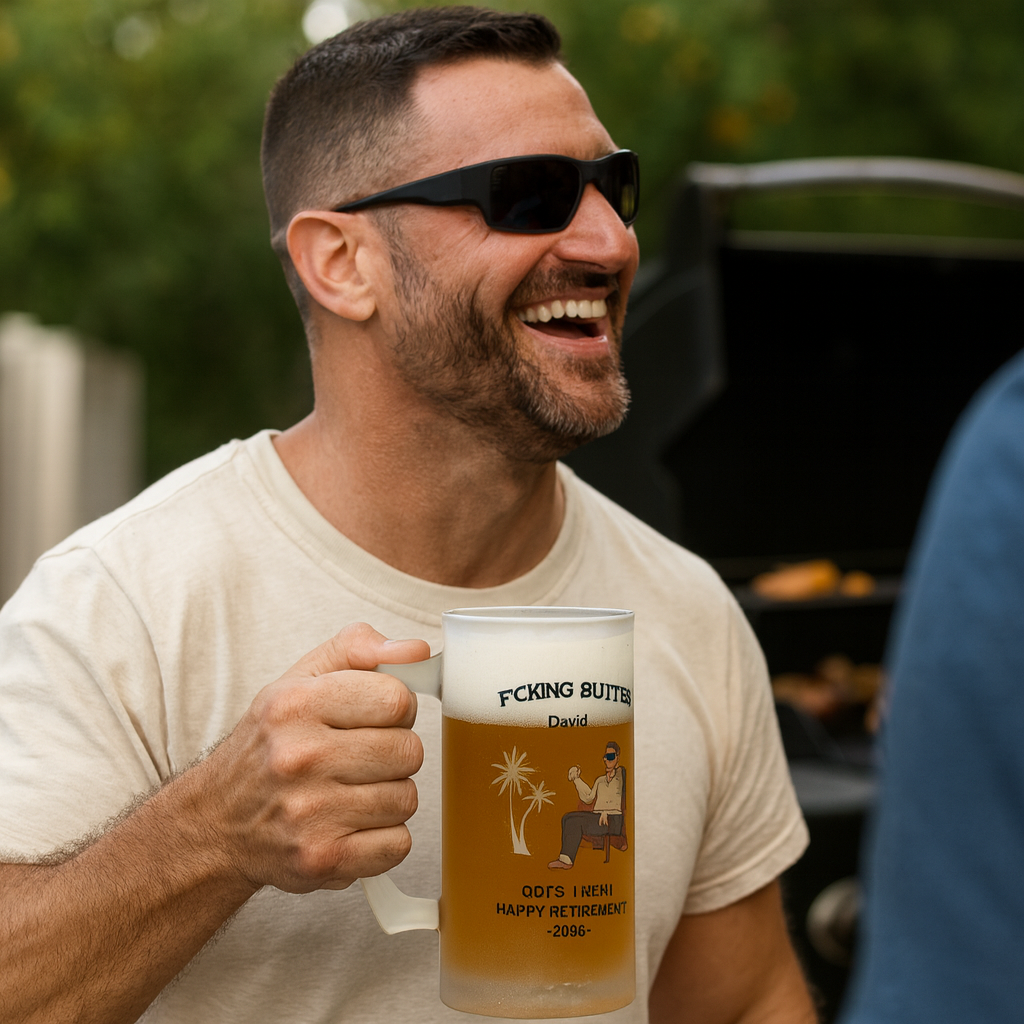 F*CKING QUITTER 16oz Frosted Beer Stein – Personalized HAPPY RETIREMENT Gift