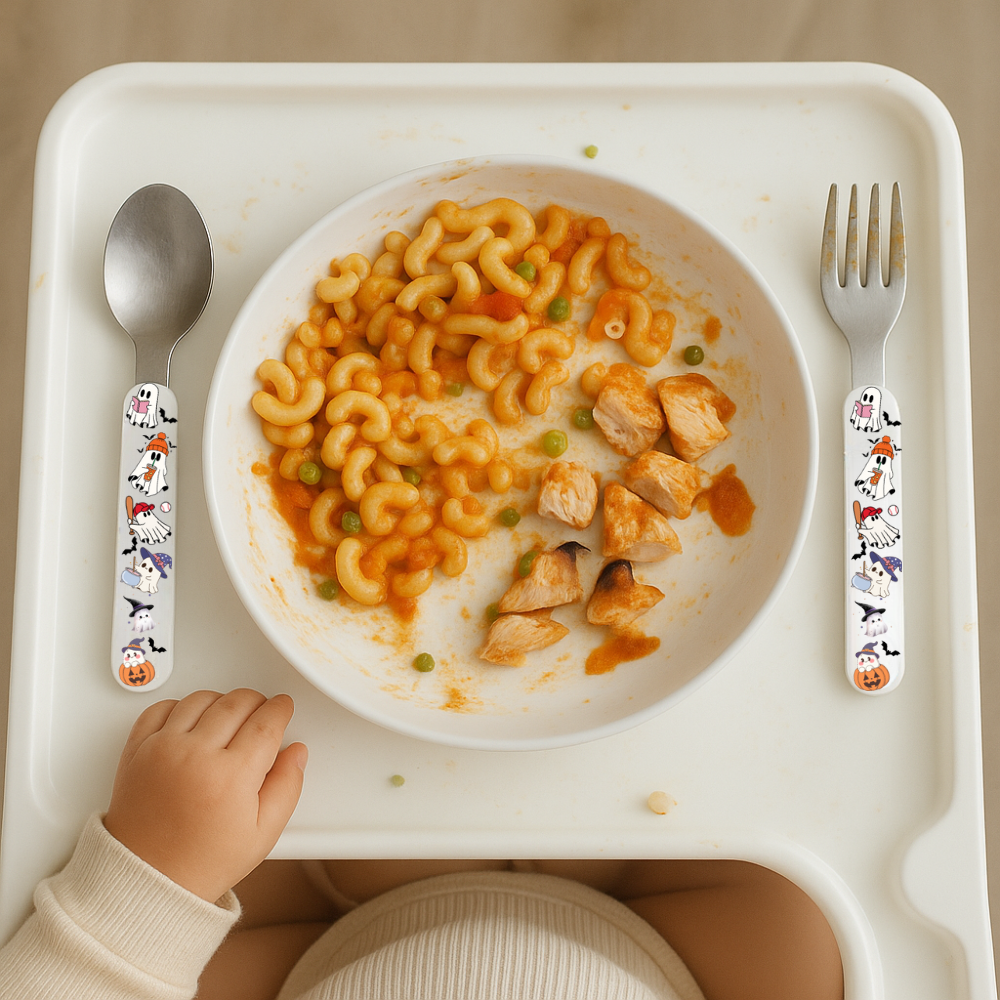 Ideal for babies, toddlers, and preschoolers, this spoon-and-fork duo makes a thoughtful gift for baby showers, first birthdays, daycare essentials, or spooky-season surprises.