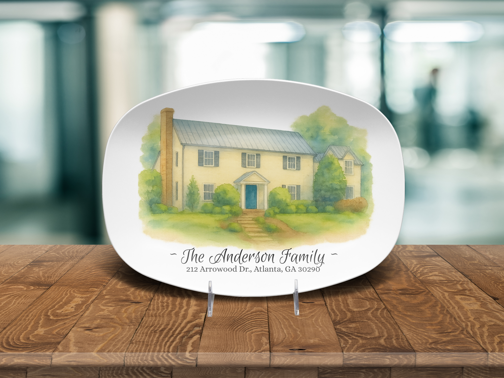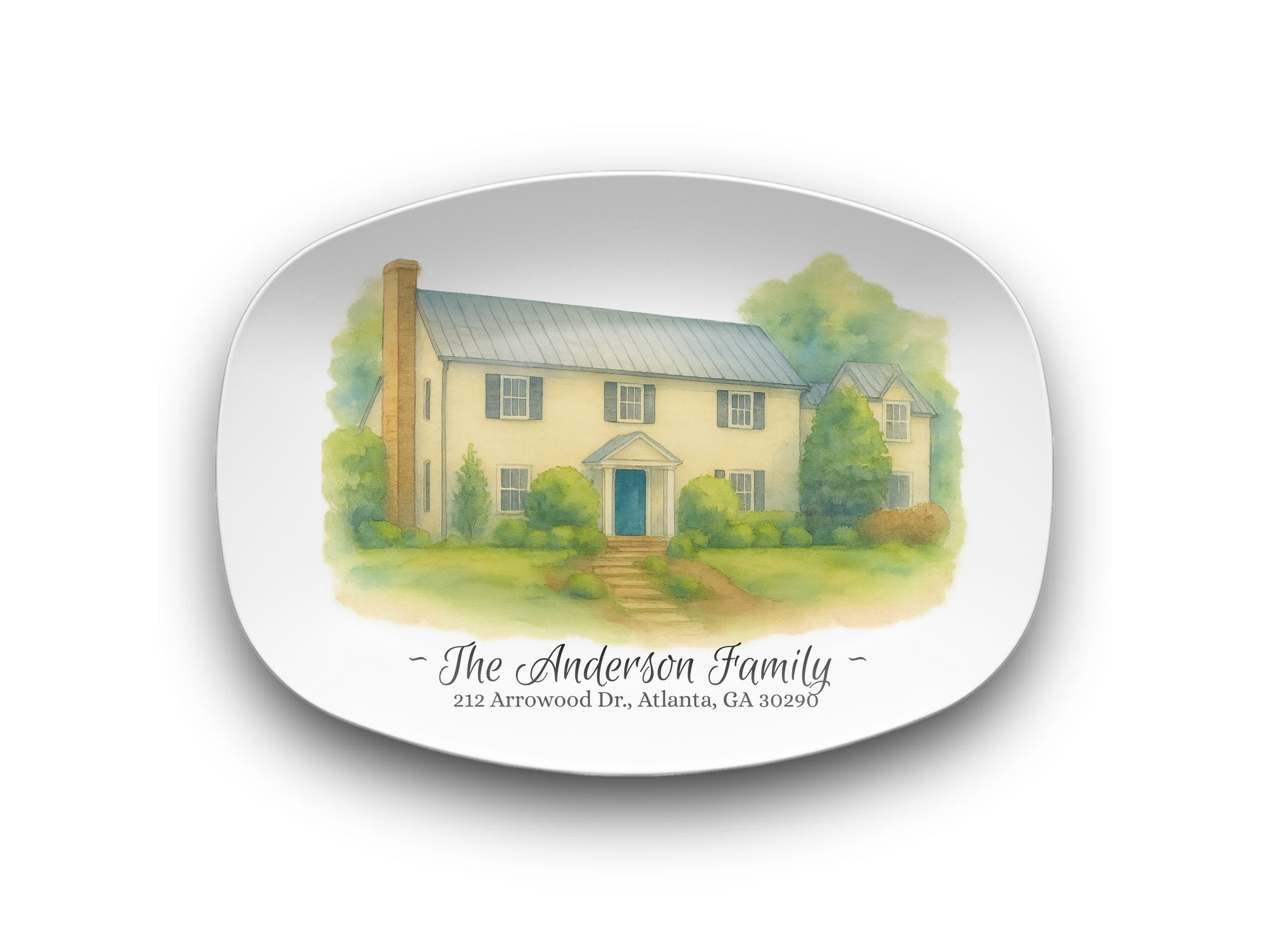 Whether you’re celebrating a new address, hosting a holiday feast or simply want to brighten someone’s kitchen, this personalized platter combines heartfelt design with everyday durability. The custom watercolor rendering of your home and elegant family name make each meal a memorable occasion.
